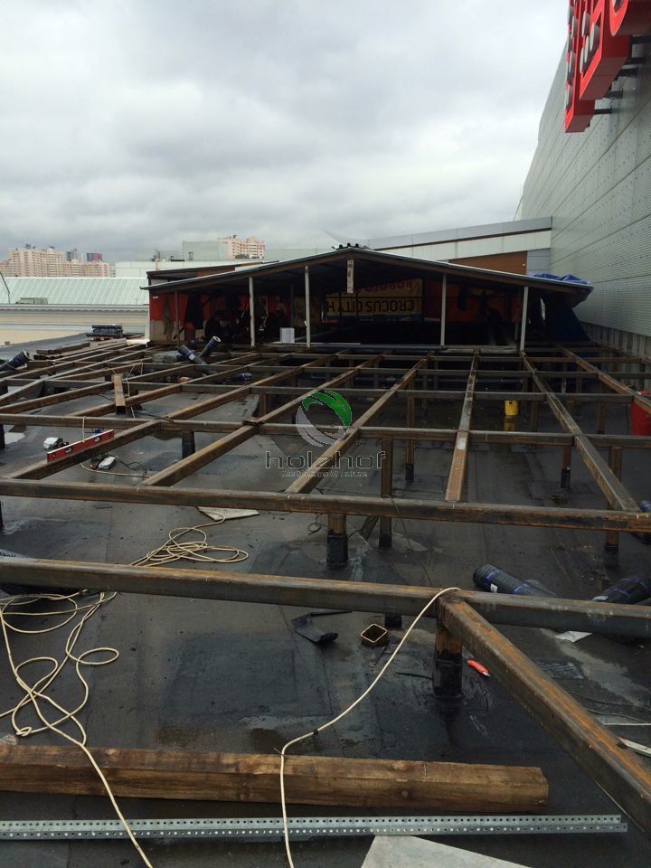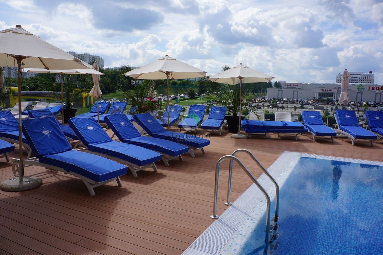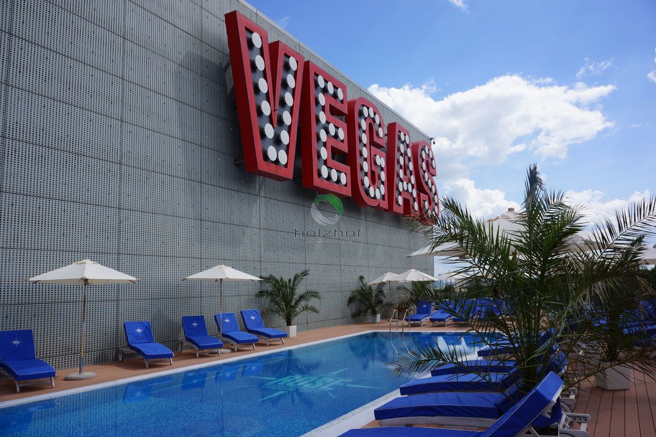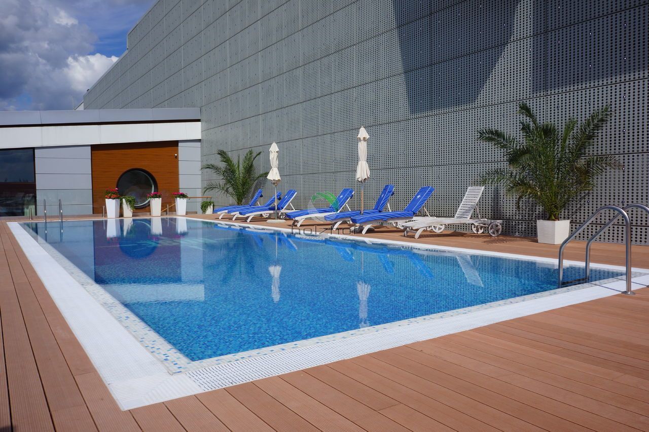 На дворе лето, а это значит, что все мы будем отдыхать и купаться! Кто-то поедет на водоемы, а кто-то предпочитает бассейны и комфортабельные шезлонги! Всем городским жителям знакома ситуация с поисками оазисов в городской черте, что бы с комфортом отдохнуть и провести время. Одним из таких мест, можно по праву считать бассейн в торговом центре «Вегас» (м. Мякинино, территория Крокус), с которым нам посчастливилось поработать в этом году. Нашими специалистами была подобрана террасная доска марки Holzhof шовного типа 22 миллиметра, которая не только идеально вписалась в общий интерьер открытой зоны бассейна, но и отлично подошла для душевой зоны в раздевалке. Данная конструкция представляет из себя эксплуатируемую кровлю. На каркас из квадратной трубы была закреплена алюминиевая лага, а затем на неё установлена террасная доска.