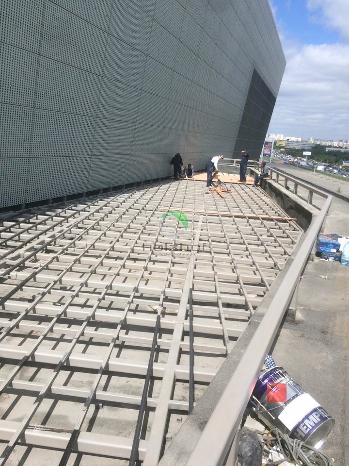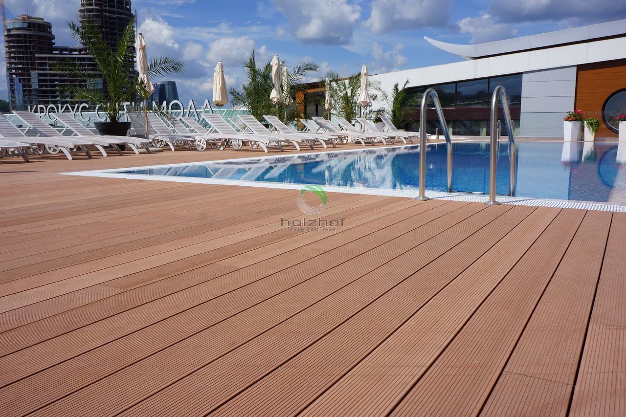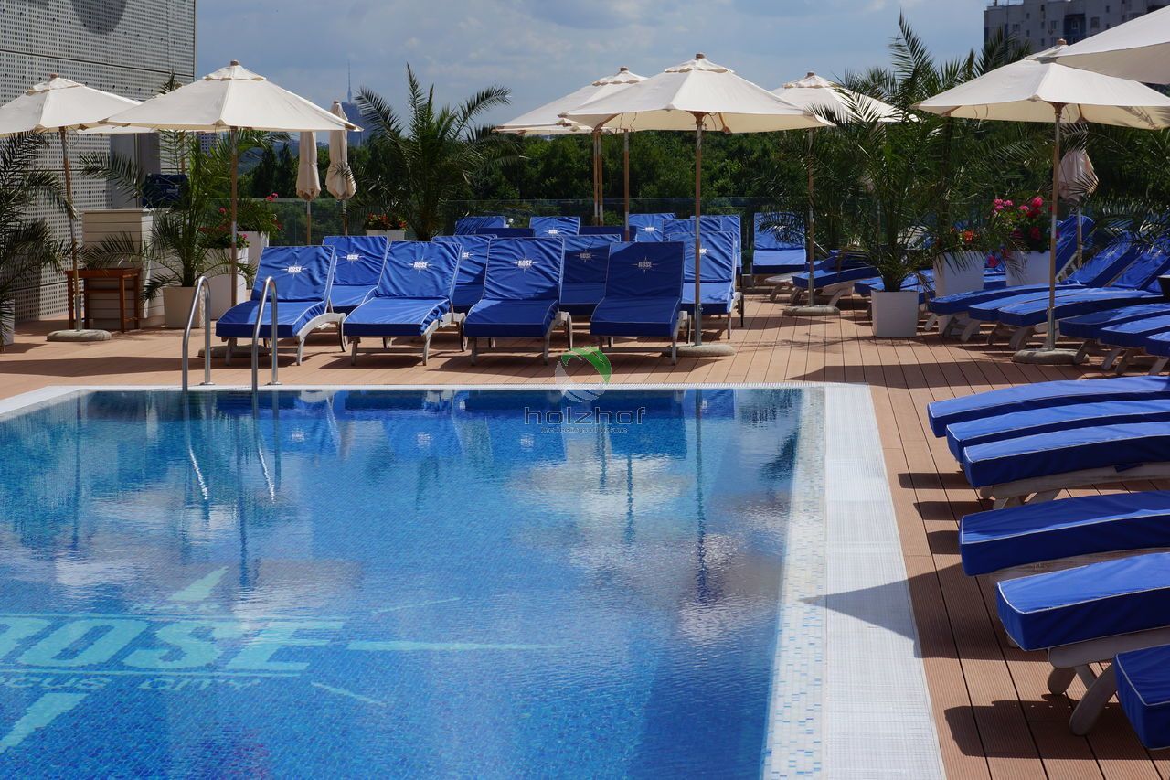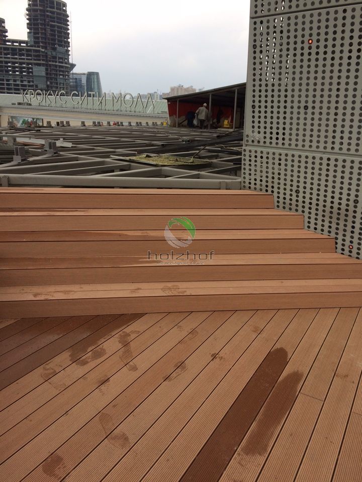 На дворе лето, а это значит, что все мы будем отдыхать и купаться! Кто-то поедет на водоемы, а кто-то предпочитает бассейны и комфортабельные шезлонги! Всем городским жителям знакома ситуация с поисками оазисов в городской черте, что бы с комфортом отдохнуть и провести время. Одним из таких мест, можно по праву считать бассейн в торговом центре «Вегас» (м. Мякинино, территория Крокус), с которым нам посчастливилось поработать в этом году. Нашими специалистами была подобрана террасная доска марки Holzhof шовного типа 22 миллиметра, которая не только идеально вписалась в общий интерьер открытой зоны бассейна, но и отлично подошла для душевой зоны в раздевалке. Данная конструкция представляет из себя эксплуатируемую кровлю. На каркас из квадратной трубы была закреплена алюминиевая лага, а затем на неё установлена террасная доска.