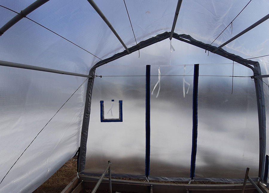 По низу добавлен материал пленки, чтобы чехол доставал до земли. Но все равно мы рекомендуем обустроить низ теплицы фундаментом из бруса или толстой доски, чтобы было к чему крепить и прижимать чехол.